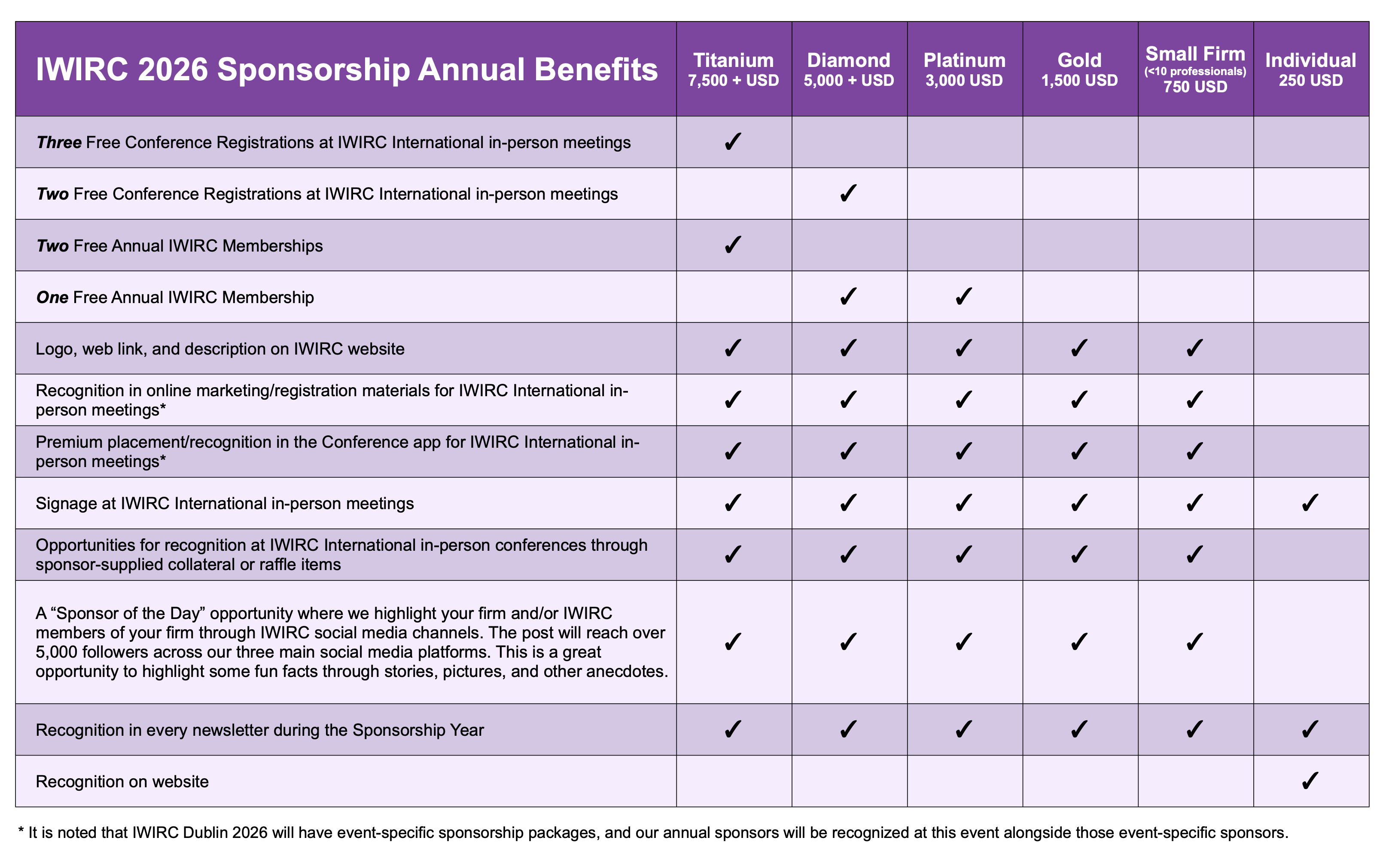 - Recognition in online marketing/registration materials for IWIRC International in person meetings